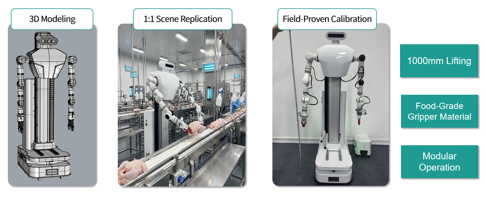 In the meat processing workshop, AI recognition equipment combined with robotic arms is adopted to sort and process chicken, which reduces labor costs and achieves higher work efficiency.