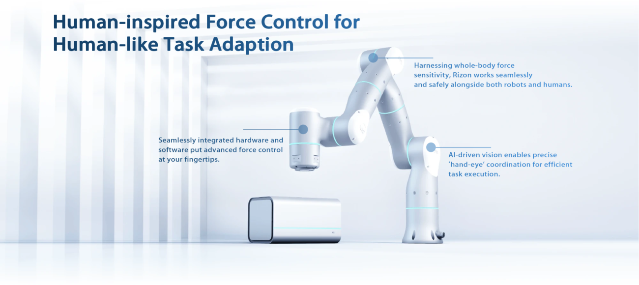 Engineered to deliver human-like dexterity and intelligent force control for industrial automation, Rizon features whole-body force sensing, AI-powered vision and industry-leading precision. It redefines flexible manufacturing by collaborating safely and seamlessly with humans and other robots. Offered in four dedicated models—Rizon 4/4S/10/10S—it adapts to a wide range of industrial scenarios, from precision inspection to adaptive assembly, empowering businesses with unparalleled workflow flexibility, efficiency and scalability.